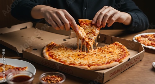 Taking a Slice of Cheesy Pizza From a Delivery Box on a Table
