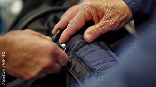 Taking Blood Pressure: Doctor's hands wrapping a blood pressure cuff around a patient's arm and inflating it.