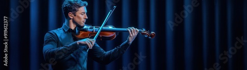 Talented musician playing the violin on stage against a dark, dramatic backdrop, capturing the passion and skill of a live performance.
