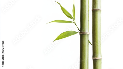 Tall bamboo stalk with delicate new leaves growing, isolated on white background