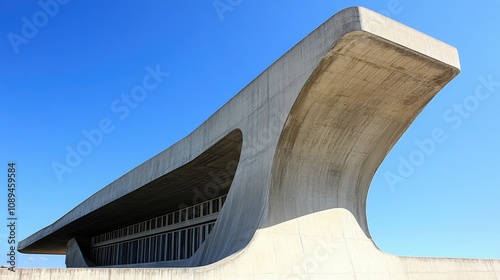 Tall concrete structure with clean lines and unique shape under a bright blue sky, showcasing modern architectural design.