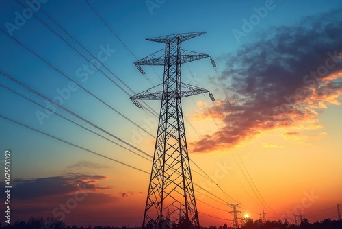 Tall electrical transmission tower with power lines against a vibrant sunset sky with scattered clouds