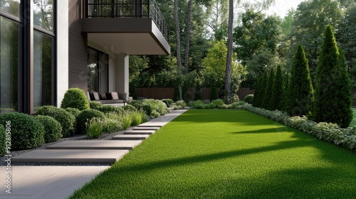 Tall evergreen trees line the edge of a vibrant green lawn under a clear blue sky, creating a serene and inviting outdoor space next to a contemporary house