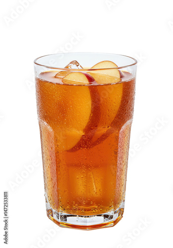 Tall glass filled with refreshing iced tea and fruit slices. Bubbles rising