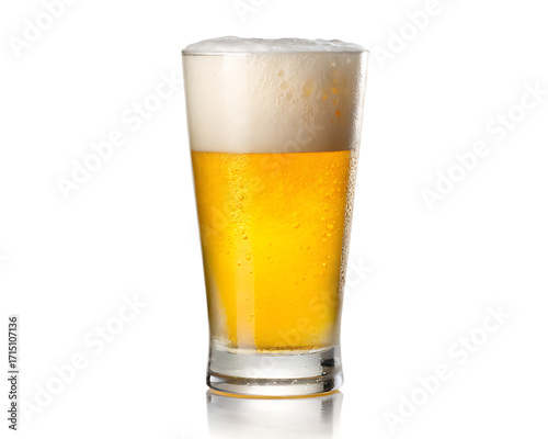 Tall glass of golden beer with foamy head isolated on a transparent background drink