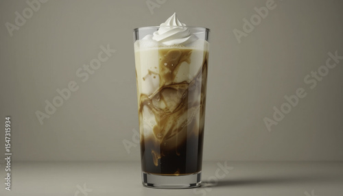 tall glass of iced coffee with milk swirls and topped with whipped cream sits on neutral background, creating refreshing and inviting appearance