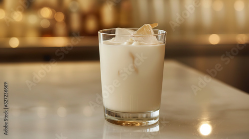 tall glass with white milk cocktail, with small ice cubes on top, on the counter in a luxury restaurant, with a beige and gold color palette