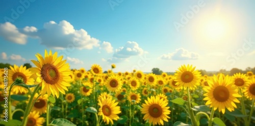 tall golden yellow sunflower fields on a sunny summer day, outdoors, greenery