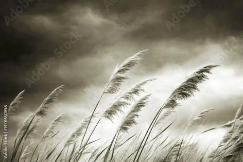 Tall grass sways gently under a dramatic, dark sky, creating a serene yet powerful image.