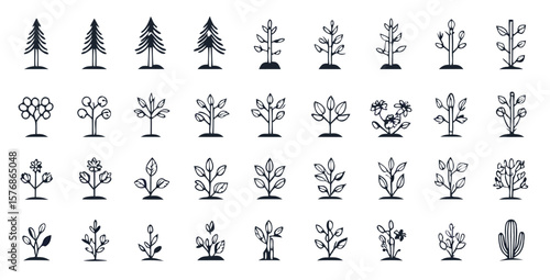 Tall Pine Tree, Small Bush, Mini Tree, Flowering Plant, Tree with Leaves, Plant Growth, Garden Tree, Cactus, Botanical Icons, Leaf Tree, Line Plant, Nature Stem, Organic Icon, Plant Detail, Tree Top.