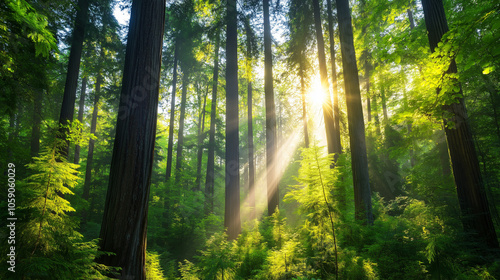 Tall redwood trees in a foggy forest with gentle sunlight streaming through the branches.
