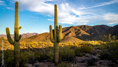 Tall saguaro cacti stand guard over a desert landscape bathed in golden sunlight, a picturesque view of the arid mountains in the distance.