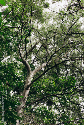 Tall tree branches reaching towards a cloudy sky in a lush green forest during daylight hours