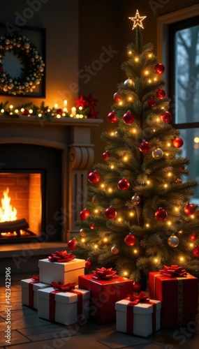 Tall tree, wrapped gifts, fireplace's warm light , presents, night