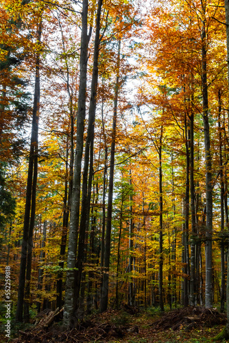 Tall trees of the Carpathian forests, nature reserve in the Carpathians, Ukrainian forests and reserves. Autumn landscape in the forest