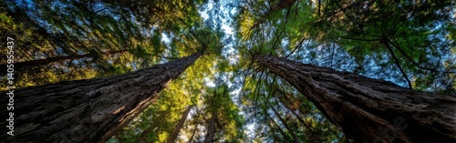 Tall trees reach toward the blue sky in a forest