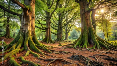Tall trees with gnarled branches and roots stretching out over the forest floor surrounded by fallen leaves and ferns, branch, outdoor