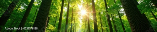 Tall trees with sunlight filtering through leaves, forest, foliage, nature
