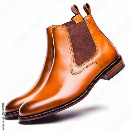 Tan leather chelsea boots, studio shot, white background, footwear fashion