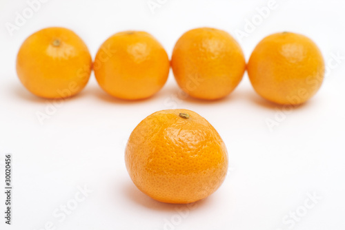 Tangerine in front in focus with blurred row of mandarins