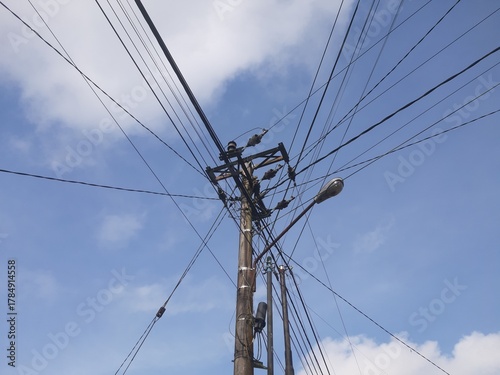 Tangled Power Lines and Utility Pole Against Blue Sky