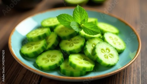 Tangy pickled cucumbers, vibrant green, arranged on a plate , fresh, food photography