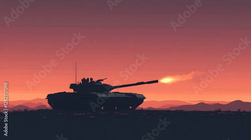 Tank firing at sunset, military vehicle in action against vibrant sky, emphasizing strength and strategic power.