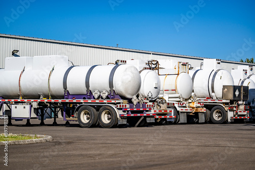 Tank Semi Trailers for chemicals and liquefied substances transportation stand in a row on the industrial warehouse parking lot waiting for the next freights