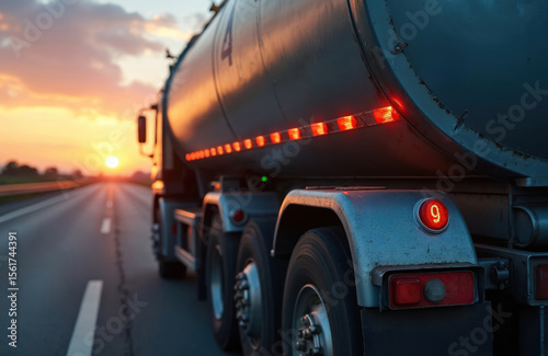 Tanker truck with danger labels transports hazardous goods. Number nine warning sign for environmental contaminants. Transportation of flammable liquids at sunset. Logistic, delivery, fuel, pollution.