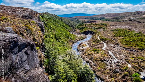 Taranaki Falls track in Tongariro National Park, alpine bushes on the river bank