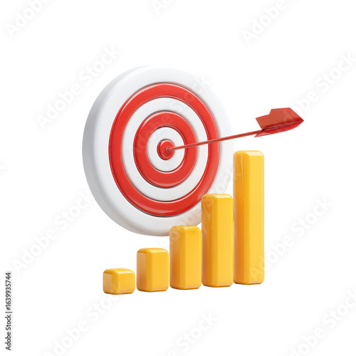 Target achievement with an upward trend represented by bars and a dart hitting the bullseye
