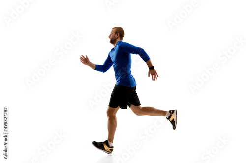 Target. Caucasian professional jogger, runner training isolated on white studio background. Muscular, sportive man, emotional. Concept of action, motion, youth, healthy lifestyle. Copyspace for ad.