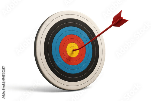 Target hit bullseye, red arrow achieving business success, goal accomplishment, accuracy concept on transparent background