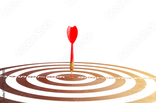 Target hit in the center by arrow. Success goals Targeting the business concept. Close up shot red dart arrow on center of dartboard, isolated on white background with clipping path.