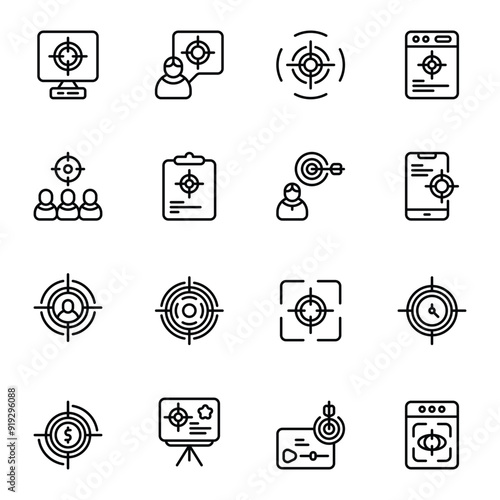 Target icon set. Includes aim, business, computer, focus, shoot, team work, web browser, and More. Outline icons vector collection.