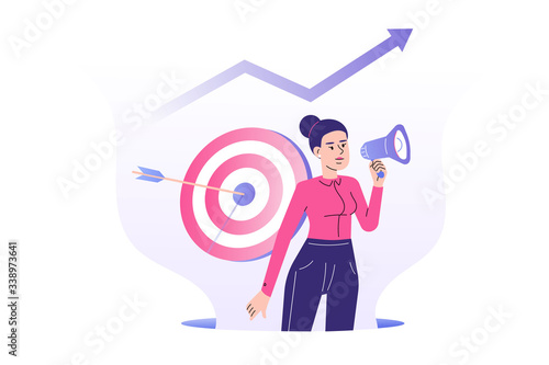 Target marketing concept. PR manager woman attracting customers with a megaphone. Successful business or consumer targeting. Focus group. Goal achievement. Online advertising. Vector illustration