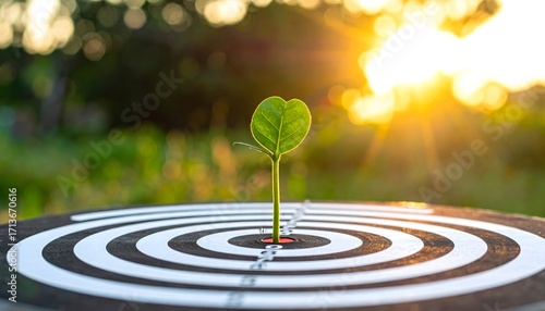 Target success: Budding plant sprouts from bullseye, symbolizing growth, achievement, and hitting goals with golden sunlight