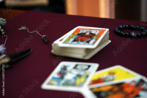 Tarot cards, magic bracelet, amulets, ritual knife and amethyst stone on the table. Occult, esoteric, divination and wicca concept. Mystic and vintage background.