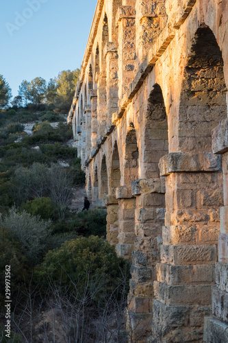 Tarragona Spain. Roman Ponte.Roman aqueduct with arches. Blue sky with sunset.