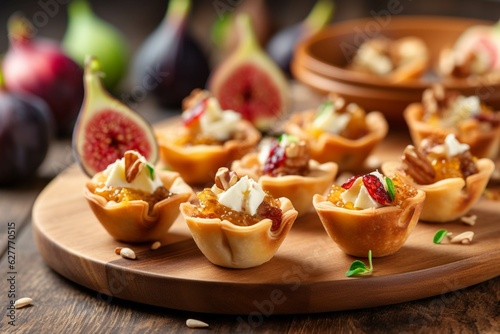 Tartlets with figs and cream cheese on a wooden table