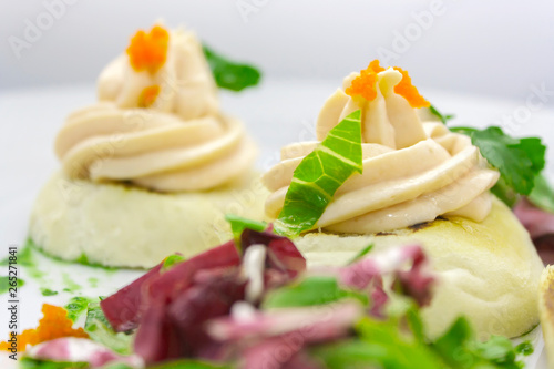 tartlets with red caviar, butter, sprigs of parsley and lettuce on a white plate on a white background