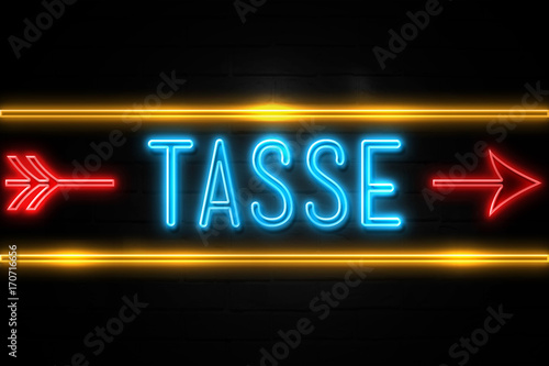 Tasse - fluorescent Neon Sign on brickwall Front view