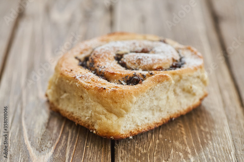 Tasty buns with raisins on a brown rustic wooden table. fresh bakery. breakfast. bread. top view