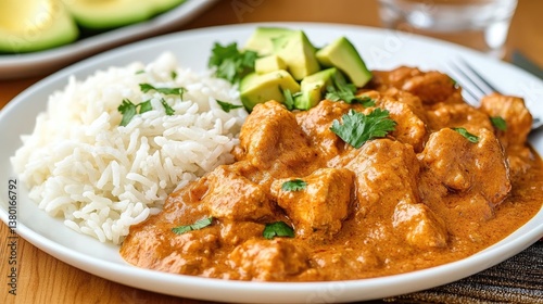 Tasty chicken in red sauce accompanied by fluffy rice, beans, and a refreshing avocado salad, all set on a wooden table