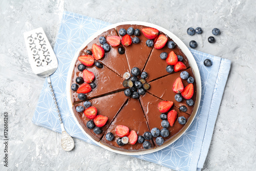 Tasty chocolate cheesecake with berries and server on light grey textured table, flat lay