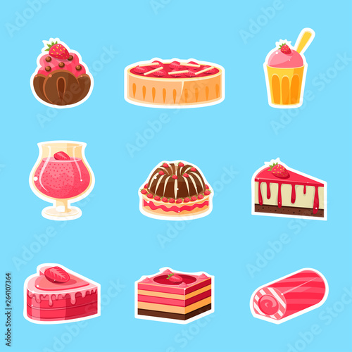 Tasty Desserts Stickers, Cute Colorful Badges of Cake, Cupcake, Ice Cream, Roll, Pudding Vector Illustration