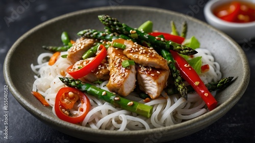Tasty dish of Asian cuisine with rice noodles, chicken, asparagus, pepper, sesame seeds and soy sauce