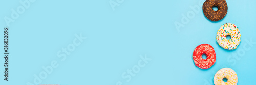 Tasty donuts of different types on a blue background. Concept of sweets, bakery, pastries. Banner. Flat lay, top view