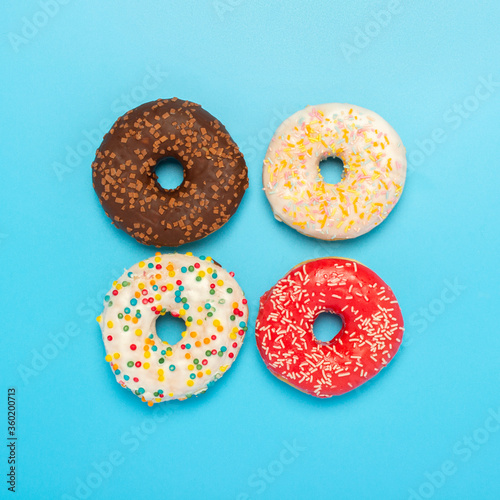 Tasty donuts of different types on a blue background. Concept of sweets, bakery, pastries. Square. Flat lay, top view