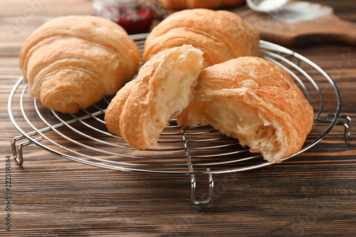 Tasty fresh croissants with cream on cooling rack